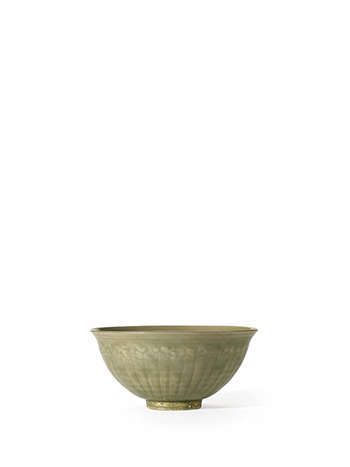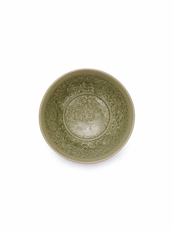 此碗器形碩大,深弧腹,口部略外撇,圈足。碗內壁模印纏枝團菊紋,底部為兩朵團菊相背。通體施耀州窯青釉,釉色深沉、典雅,造型簡約。耀州窯瓷器中,印花為主要的一種裝飾手法,紋飾多模印花卉、動物、人物等。而此碗造型碩大較為罕見,為耀州窯瓷器中值得收藏的一件。
