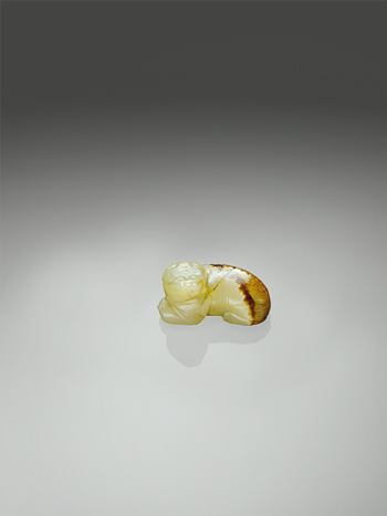 整料黃玉雕成,局部有褐色斑。瑞獸側首伏臥,下顎輕抵直伸的前肢,兩足之間有鑽孔,可繫繩佩帶。瑞獸如意形耳,額上兩道平行紋,增添瑞獸的鮮活情態。雙眼炯炯直視,一派稚拙可愛的模樣,是一件能療癒心靈的隨身雅玩精品。L: 4.7 cm