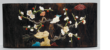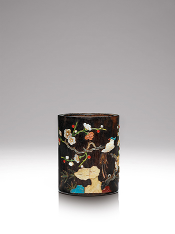 筆筒紫檀木雕成,做圓筒貌。外壁以螺鈿、茜牙、珊瑚、瑪瑙、玉石等珍貴材料, 依據事前摹刻的粉本,鑲嵌成色彩繽紛的梅竹禽鳥圖。 是件百寶嵌構圖簡潔,布局 合理且意趣盎然,此間,禽鳥立於梅樹枝頭,更予人有喜上眉梢的吉祥聯想。 H: 12.5 cm