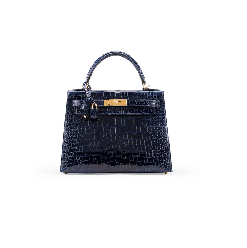 亮面寶石藍色POROSUS鱷魚皮32公分外縫凱莉包附金色金屬配件