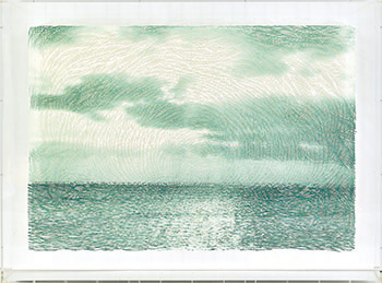 《海平面》由一疊切割過的楮紙(桑紙)交織而成。楮紙的特色是強韌、有吸收力。選擇楮紙做為素材,也碰巧與海洋的特性所穩合。海平面上刻劃出波浪紋,突顯出隨即而來的海風。作品本身沒有中心點,但隨著波紋的輪廓將觀者的視線導引到中央的海平面。海浪的漣漪效果一路延伸到外圍,彷彿生機蓬勃的植物一般,滋養著各種形式的新生命。這幅作品乍看是平面的海洋,卻能從不同的觀看角度欣賞,無論是從海平面上或海平面下,亦可平行直視,想從各個角度看都可以。這幅作品的多重視角,就如水能夠孕育各種生命一樣,如此多元。