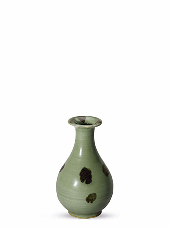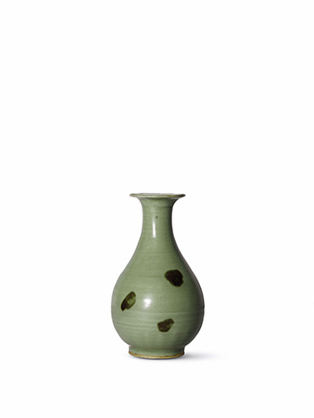 龍泉窯是著名的青窯瓷場,窯址在今浙江省龍泉市境內,宋元時期燒造盛極一時。此瓶撇口圓唇,溜肩,垂鼓腹,底呈圈足;此瓶器形修長飽滿,秀美挺拔,曲線玲瓏,線條優美。加之胎質細膩,胎體較厚,全器施青釉,釉色清淡瑩潤,人稱「橄欖青」者,青釉上點飾鐵色斑點,斑點不規則分布在瓶身,大小、色澤各異,此品種在日本被命名為飛青。為金元時期龍泉窯器物的佼佼者,釉水肥潤,修足工藝講究;在龍泉窯玉壺春瓶中也屬精品之作,製作考究,保存至今,極為珍貴。