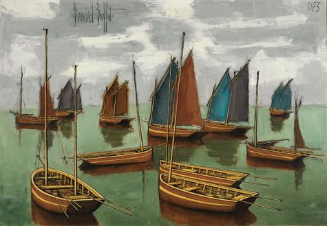 himself later recalled “There has never been a happier time than painting the “Ship” series.” “─ Nick Foulkes on Bernard Buffet: The Invention of the Modern Mega- Artist “Bateaux au Mouillage”undoubtedly forms part of an important series of his works depicting port cities and ships in the early 1970s. The surface of sea while as flat as the mirror, reflecting the static boats. The cross- coloring technique applied between the bluish- green sea water and the inverted image of boats, leading the viewers to come into the bay. The boats seem to be swaying from side to side under the breeze, the sides of the boats and the waves stir up splashes and ripples. The artist cleverly manipulated the layout in order to crave out the composition, along with repeated seascape, making the perspective of the viewers both vivid and active. The cloud-covered sky seems to harbinger an upcoming storm, the sailboats swayed slightly on the sea level, showing the artist’s joy and his surging mood.