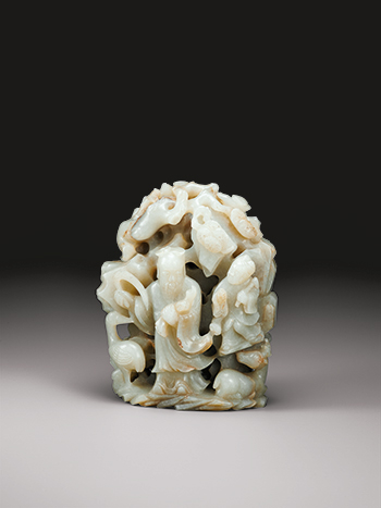 Carved from white jade, this piece takes on a slight bluish-white hue. The techniques of drill pipes and relief are largely employed to remove the jade stone textures that lack desired patterns, creating a three dimensional effect through multiple transparent mountain peaks. On the front, a pine tree standing on a huge rock serves as the background. In the middle, an embossed scholar holds a duster. To the right of the man stands a celestial crane looking back, and to the left stands a child servant. Under the child is a crouching deer looking back. At the back of the sculpture, instead of human figures, the intertwining branches of the pine tree wind around the rock with glossy ganoderma popping out from the crevices, creating a scene of a worldly paradise. The scholar expresses a lofty and cultivated spirit, and the images of a crane and deer suggest endless aspiration for longevity.