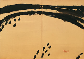 從50年代的靜物畫中得以瞧見野獸派的影子,而60年代實則開始有了更多抽象作品和許多簡化過的象形符號隱匿其中,可見曾氏根源的中國文化油然躍上畫紙;70年代起,曾氏的作品風格大為改變,開始爬梳水墨抽象創作的更大可能性,也正是在這時候出現了多篇雙聯幅作品,成為曾氏獨特的藝術語彙,此作更是他尋求心靈層次提升的系列抒情作品;豪邁的揮寫墨跡展現對於筆墨的精巧掌握,而單以線條、點構成的畫面富含禪意;曾氏不流於形式的創作在畫面上營造出詩意般的細膩氛圍,不追求波瀾壯闊或是蕩氣迴腸的恢弘格局,但流洩出當時藝術家對於生活上無爭、無為的處世精神;是他悟道後的寄情抒發,也是他與藝術和自我內在無止境的對話。