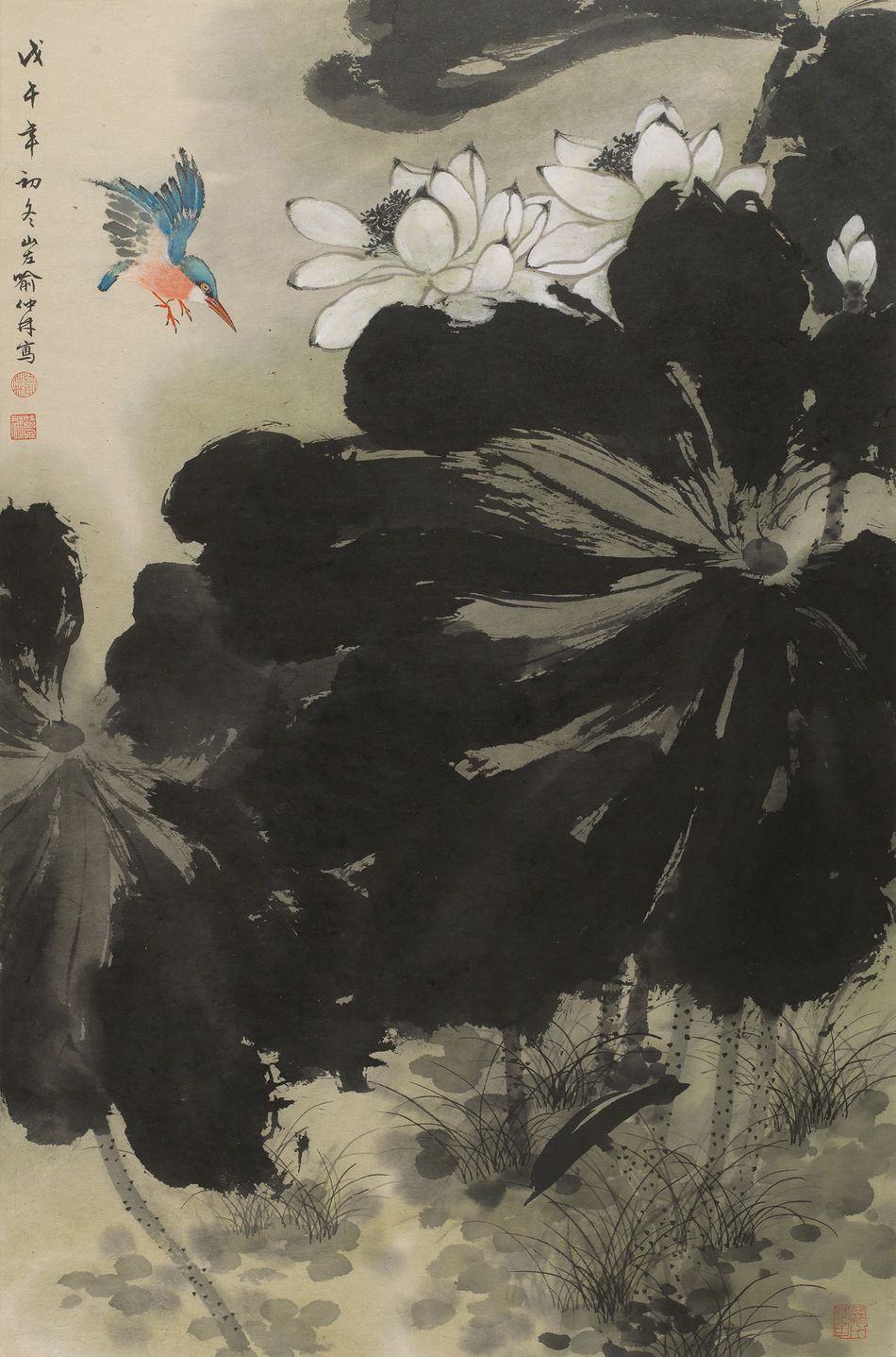 喻仲林的工笔花鸟画深受张大千青睐,喻氏后期迁居云河大厦,与当时归台的张大千比邻而居,两人结为忘年之交,大千肯定喻仲林能坚持传统工笔花鸟一脉,常予以私藏的古画临摹,可知大千惜才之心。《荷塘情趣》通幅运笔生风,兼有徐渭大写意墨荷画意与张大千破墨笔意;水墨写荷先描荷茎,喻仲林以中锋淡墨直取,施以墨苔作微刺,占据图面的荷叶则先取中心圆点,后以健毫散锋扫出、浓墨点厾一挥而就,浓墨淡墨施用,既能得形似又有神和;荷花以双钩圈瓣,敷以胡粉作出白荷清癯风貌,荷蕊莲蓬则用细笔流水线法施墨写就,其精致程度令人叹为观止;荷塘上飞舞着一只红腹青背鸟,喻仲林以枯笔皴擦、兼用墨色与花青刷出振飞的翅羽,朱磦敷染鸟腹,细笔钩勒鸟喙与勾爪;荷塘水草以长锋清扫交凤眼,细密有致,其中醒眼之处在于以破笔扫撇出水草丛中抽长、尚未舒展的荷叶,让看似闲淡的风景带有潇洒之意,实为喻仲林少见、清新奇巧的大写意名作。