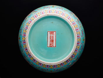 瓶撇口,長頸,溜肩,長圓腹,腹下漸收,圈足。外壁滿施綠釉為地,口沿外施描金一圈,描金下飾黃彩如意雲肩紋,肩部一圈花卉錦地寬帶紋,寬帶紋下繪黃彩如意雲肩紋,腹部近底足處飾一圈變形蕉葉紋,足牆外壁繪二方連續荷花紋,頸壁與腹壁作纏枝番蓮花紋,蓮花底懸垂磬,上托卍字;左右安「吉」字;綰合出「洪福齊天,吉慶萬福,萬代富貴」的吉祥寓意。底書紅彩直方框「賜經樓製」單行四字篆字款。