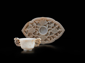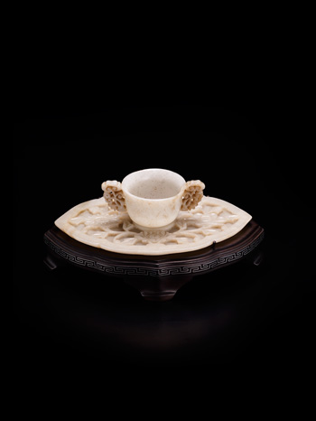 玉色乳白,局部有褐色沁斑與點狀蝕斑。杯與托合為一組,杯敞口,深弧腹,圈足,兩側透雕花葉板片為.,腹壁雙勾纏枝花卉紋。托盤呈海棠式,盤口面緣琢二方連續方雷紋一圈,托盤中央減地成凸起圓台,圓台直徑恰可容納杯足,圓台外的盤面以陷地深刻技法,高浮雕纏枝花卉紋。是件托杯用料大器,所鐫花紋典麗瑰美,且萬代富貴的吉祥寓意,信為明代貴冑的珍貴用器。