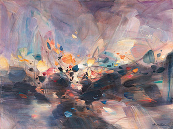 1990年代的朱德群,已經歷抽象風格的轉換、成名與榮耀,畫筆的揮灑更顯自在、遊刃有餘。在這幅1994年創作的《喜悅的彌漫》中,通透的空間感,晶瑩跳耀的色塊,光影對比的活力,大氣流動的勢態,在有如天地初開的磅薄渾沌中,躍有形與無形之界線,暢所欲書,快意淋漓!朱德群曾自述他的創作靈感源於大自然,他專擅將其豐富無窮的雄偉壯麗,以翻飛的動感與華麗的色彩展演出不曾停歇的奧妙變化。韻律性以及時間感的協調,引人入勝。朱德群特別善於透過明暗反差展現光的璀璨,《喜悅的彌漫》即是一個傑出的例子。畫面基底以筆刷大塊面掃過,如書法用筆一般流暢自如。畫面中部的大塊面黑色,如亂石崩雲,與畫面上層細碎的橘色,玫紅,黃色色塊形成鮮明對比,色彩互相投影反射,光芒跳躍於其間,繽紛絢麗,充滿生機。在藝術家慎密的構思佈局之下,光與色彩互相碰撞,看似混亂且騷動,卻又共同組成一曲合諧且壯闊的交響樂章,渾然天成。大自然的力量在此轉化為光與色的舞動,散發出扣人心弦的感染力,正如《喜悅的彌漫》標題所點出的,畫面雖是抽象,但傳達的是最真實、存在於天地之間的自然脈動。朱德群的一生皆繫於他的藝術,他專注、堅持、單純地一路直行,觀者從他的畫中,點點滴滴分享了他生活裡的枝微末節與重要篇章,儘管畫面是抽象,那情緒的起伏悸動、那思潮的湧現、那面對宇宙大地的省思與心靈感受⋯一再一再引領觀者神遊其中,感動久久。老子:「大音希聲,大象無形」,如此富於詩意的哲思,朱德群在他的作品中,已向全世界的藝術愛好者盡顯這至高的美感境界。