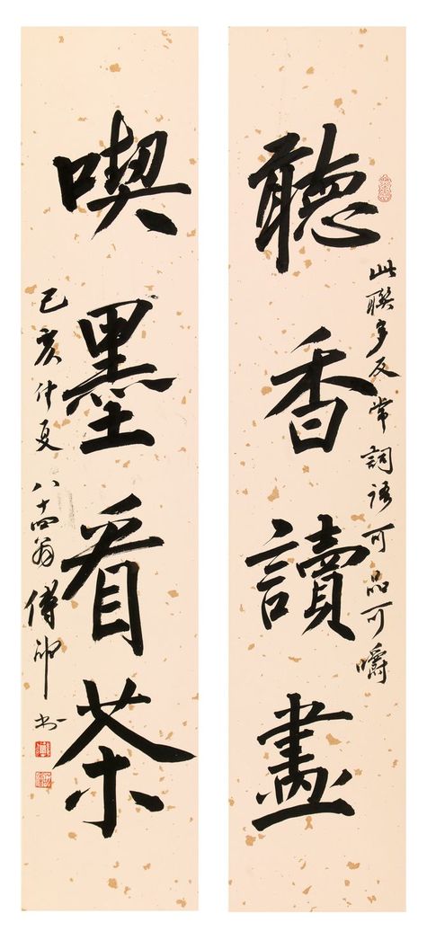 款識:此聯多友常詞語可品可嚼。己亥仲夏,八十四翁,傅申書。