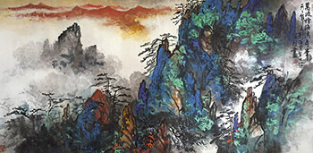 LIU Haisu, given name Pan, style name Jifang, pseudonym Haiweng. Of Han ethnicity, Liu was born in Changzhou, Jiangsu. He was both an outstanding artist and an art educator. In his early years, Liu studied oil painting, and developed a majestic antiquity style. He also painted traditional Chinese painting, in which he showed his firm, determined brush strokes. He later focused on the splash-ink technique of painting, through which he displayed a forceful spirit through brush and ink. In his later years Liu used the splash color technique, expressing himself through vibrant and vigorous colors. Yellow Mountain, composed in 1988, is an important work of Mr. Liu’s. The layers of the work are clearly defined from bottom to top. The bottom part of the painting features a close-up view of mountains, with a large part of the painting composed of characteristic hues of bright blue and green. The mountain peak is lightly outlined in faint ink, then boldly splashed with ink to create a turbulent, misty piece which exudes a deep charm. Ink is splashed several times to create distinct layers.