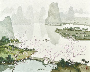 無論是寫生的靜物、或是江南山水,龎均總能將色彩拿捏得恰到好處,如同《疑似仙境在人間》,羞澀的粉白桃花映落在灕江山水中,船夫獨自一人在雲霧繚繞的山水之中滑過仙境,留下一縷白色水痕,猶如心中深處所留下的美好記憶。龎均熟稔的技法將溫和的灰色調山水,透過淡淡的粉白桃花點綴,水中映出山峰倒影,整體畫面顯得含蓄卻富含詩意。