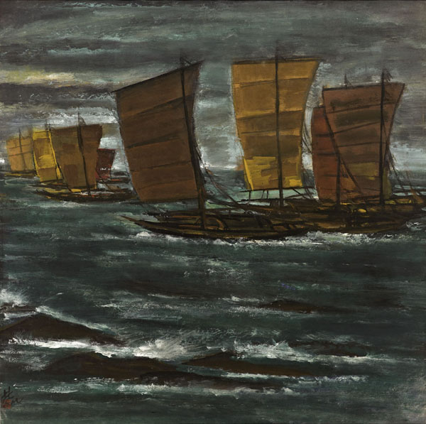 此幅「漁舟」描摹的應屬早年的江岸印象。作品採用了林風眠作品創作中較為典型的方形佈陣式構圖。以中國傳統繪畫中平遠式處理畫面。前景中深色的水面泛起白浪,中景漁舟破浪前行,遠景漁舟漸遠,層層深入,簡練的線條和平塗的彩墨渲染出平和、寧靜的氣氛。平直的斜線、弧線賦予平和在狀態以動勢與活力。材料方面,以墨為主,色彩輔之,乍看似全水墨,細品可見墨中有色,且色調豐富,層次分明。實屬林氏風景繪畫中的佳品。