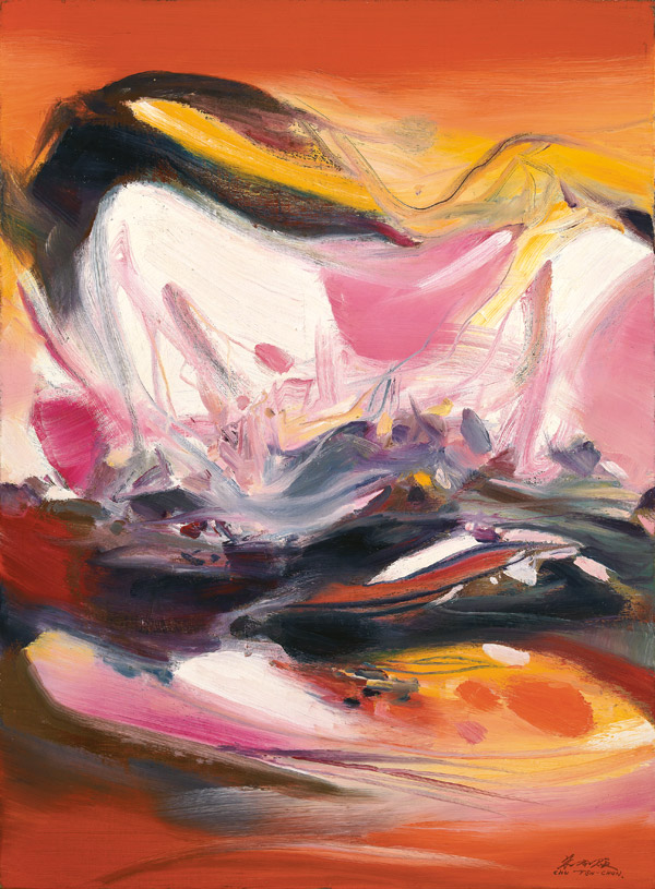 《構圖No. 538》創作於1974年,在此階段的風格中,朱德群減去刻擘般的線條處理,用筆愈加奔放率意,且以中國傳統繪畫的飛白手法,創造出紛層漸次的色彩變化,與厚實油彩敷塗的組合,讓畫面肌里獲得虛實更迭的對比。朱德群的創作風格發展至此,用色更趨大膽艷麗,在作品中常使用的紅、黃、棕、黑色,以大筆刷塗的水平色塊交替鋪陳,畫面中交織的線條舞動流曳,延伸了空間的深度,呈現如蒼玄地貌的壯闊之勢。