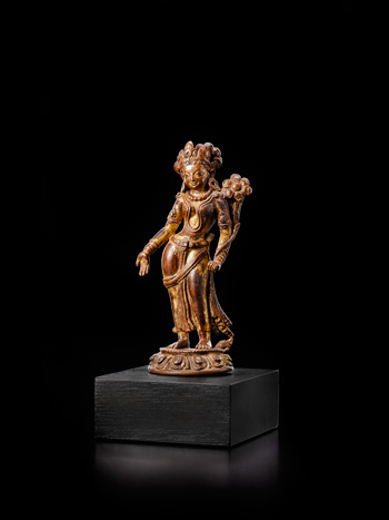 Modelled standing gracefully on a lotus pedestal in a tribhanga pose, the left hand grasping onto lotus stems blossoming at the shoulder, adorned with an elaborate diadem below the circular earrings, festooned across the body with beaded necklaces and foliate armlets, wearing a draped flowing dhoti .