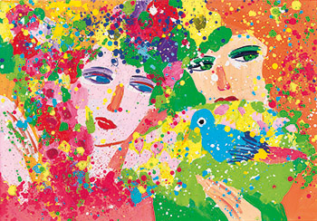 藝術家對世間萬物的浪漫情懷,無論是多彩的鸚鵡或花朵,還是水中嬉戲的遊魚,都好似徜徉於一座快樂的花園。作品很好地表達出春至的意境,畫面中那流動性高而易揮灑的壓克力顏料與直率勾勒的油蠟筆細線,艷麗底色襯著兩位美女的面頰,濃烈卻雅致的用色更顯畫中女人嫩白透粉的肌膚。手持折扇,青鳥的圖案將其半面遮蔽,僅露出一雙迷濛大眼的嬌羞神態,與身旁那全然享受春意的女子相互依襯,顯示出對這突如其來的春天,兩種截然不同的欣賞態度。