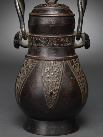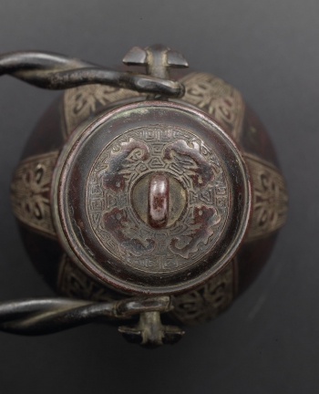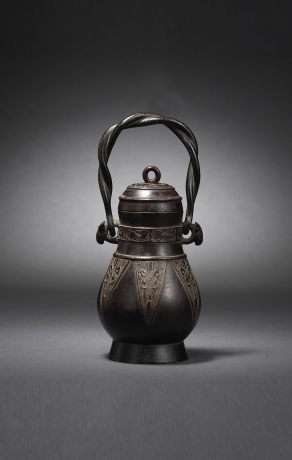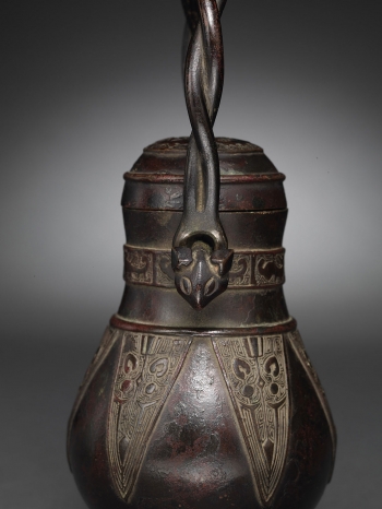 Of pear form rising to a slight flared cylindrical neck toppled with a domed cover decorated with a band of archaistic animals underneath a lopped finial, the bulbous body further adorned with a band of lappets, flanked by a pair of animal heads suspending a twisted handle.
