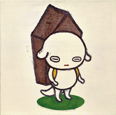 背起了全世界的悲傷獨自遠行 「28歲在德國的我彷彿跨越了時空,開始和身在青森8歲的我對話。」 1988年後的12年間,正是奈良美智前往德國杜塞道夫藝術學院留學,置身於有如與故鄉青森與世隔絕氛圍相仿的科倫旅居的重要時期。時值壯年的他,在廣受新表現主義啟蒙,以及龐克搖滾樂曲風的影響之下,藝術家創作生涯迄今最為膾炙人口—於童真的臉龐上,飽受憤怒與孤獨情緒左右的彆扭小女孩圖騰,便於此時此刻蓬勃地萌發著。.無論畫筆下揮灑的是小女孩或小狗,都是奈良美智內心孤寂感的延伸、對於美好世界抱持純真想法的一種體現。「小狗溫馴服從的特質,常令我不自覺地想起孩子的形象。」若你經常觀看奈良美智,在小女孩和小狗作為主題的眾多作品當中,都會有如同此件拍品《Dogwith Coffin》,雙眼呈現一條簡單直線的神態,當其上揚時會令觀者感到主角像是在夢遊抑或展露出愉悅滿足的情緒;若是出現其他種眼神,再搭配上嘴角或肢體狀態,將會帶來全然不同的氛圍。而此件《Dog with Coffin》,在顯露出藝術家濃烈的鄉愁、那種無從抒發,僅能用畫筆表達的內心孤寂。 「據說狗狗在去世之前,並不希望主人過於傷心,將離開原本熟悉的生活環境,找個靜僻的角落獨自面對死亡的到來。」此件《Dog with Coffin》的創作緣由,便是奈良美智想要傳達人類與寵物間長年相識相知的親密,不願對方面臨別離時出現難過之情,在生命的終點到來前,用僅餘的些許氣力一肩將棺木扛起同時離去的最後體貼。畫作中的小狗兩手前掌因用力而曲起,搭配著臉上的堅毅之情,像是寵物於一生備受寵愛後,即將展露最後一次忠誠的決心,背起了全世界的悲傷獨自遠行。而此作的顏色表現更是超卓,小狗嘴巴上的一抹紅,配上兩條肩背帶的黃與腳底一襲綠,完美地平衡了棺木深層且沉重的 色澤,藝術家運用了看似簡單的幾個顏色,點綴出極為協調的畫面,並以極具個人特色的粗黑俐落線條勾勒出主角體態。其背景大量的留白,更留給了人們對於「有限生命」的無限想像。在堪稱艱難的直向三分式構圖中,仍能表現得極為生動,不落於僵硬俗套,奈良美智的創作功力於此作上可見一斑。 「就算想哭,也不能哭的時候太多了。」旅居德國期間前後長達了12年,離鄉背井的奈良美智與故鄉間的距離有著好幾萬公里之遙,在語言全然不通的情況下,猶如一場長年自我放逐的創作之旅。「語言方面我依然自卑,和人會面就會感到痛苦。」於那段期間內,藝術家的纖細內心有如擴張到了極限,因而產生了此件作品—將棺木負重於肩上,欲就此遠離人世的感受,同時將一切的無奈、憤怒與難過⋯⋯等,全數寄情於藝術。「平靜」是奈良美智為德國時期所下的簡短註解,然而性格敏感又內向的他,一路自童年時期以來飽受的成長與孤獨,是那麼樣真切地,在一張張的作品上如實呈現。「我畫畫,只是 為了自己。」像寫日記一般,於畫布上紀錄下每日令他有所感觸的事物,直率地表達專屬於自身的喜怒哀樂。而這正是你我所熟知的奈良 美智,以及那深蘊於作品的療癒力量。