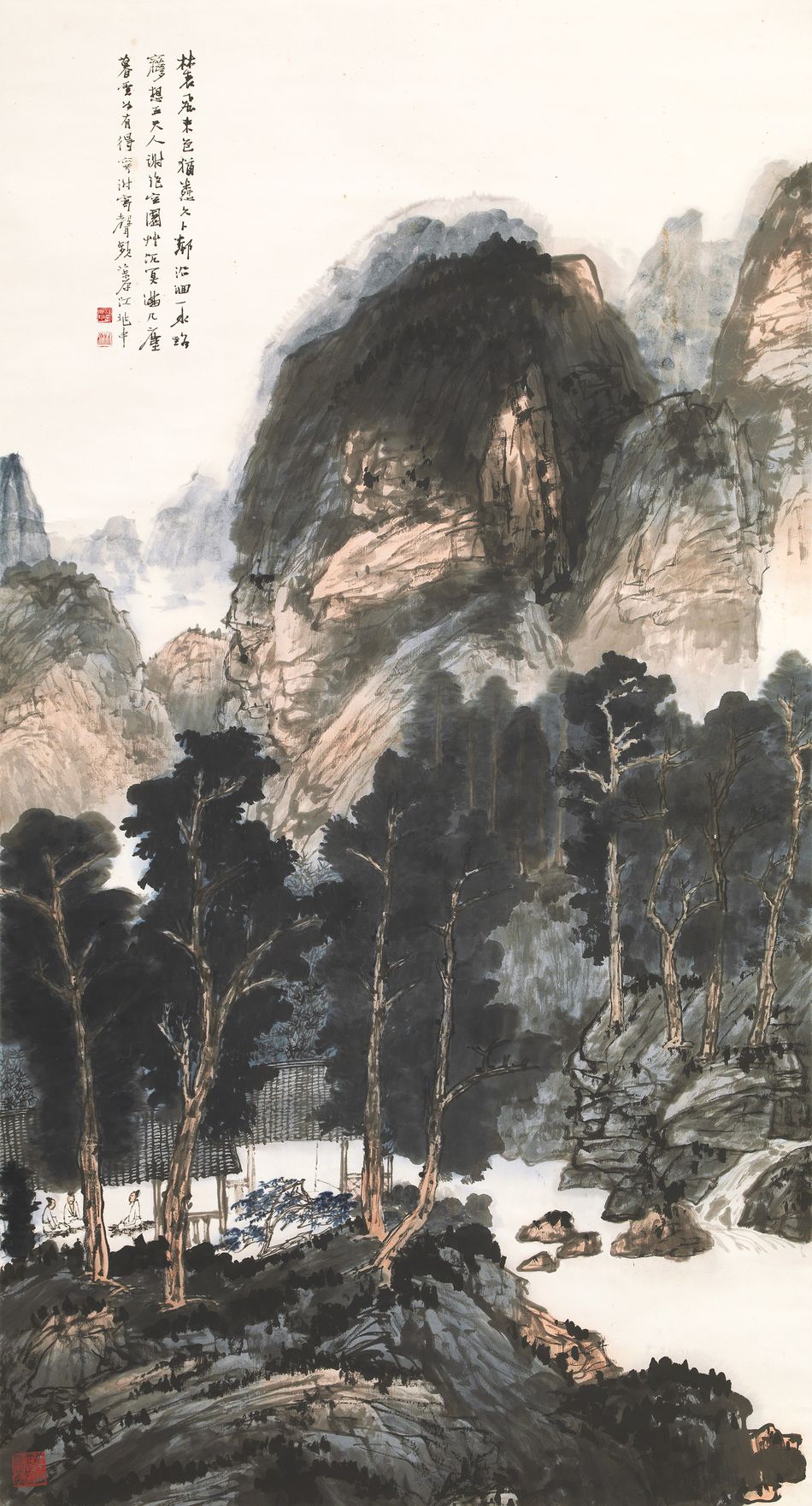 Classical techniques could be traced in Chiang Chao-shen's landscape paintings, with a unique structure, demonstrating a modern and individualistic point of view amongst classical techniques in the depiction of mountains and streams. This work was made at Chiang's mature stage of career. Techniques from ancient scrolls are prominently demonstrated with a close resemblance to nature itself. Majestic mountains of Song scrolls could be associated with this painting with a bold structure and delicate composition. Tone and colour of ink are synchronized in a literati style. Rocks were outlined boldly in Jianjiang style. Swift strokes of cun and dots highlight the texture of a rocky cliff in a stylistic approach. Colours are subtly chosen with ink, ochre and green carefully applied to highlight a realistic depiction of rock texture and to create a chilled tone to the painting. Mountains echo with the horizon with a fresh and majestic aura. Trees at the foreground were depicted with double lines, saturated and dried ink and colour. They are intertwined to form a dense forest. A river meanders through the valley with scattered houses, where three scholars chat casually. This suggests the ideal, secluded and relaxing lifestyle of Chiang. Lin Bu's poems were always used as inscriptions of Chiang, showing his preference towards an austere lifestyle of a literati.