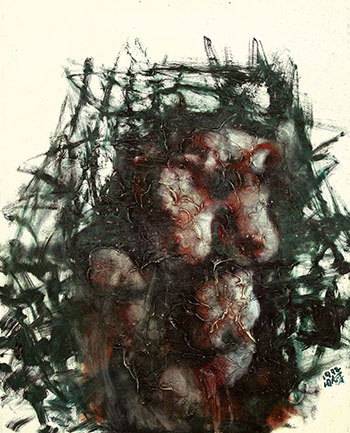 山石一直是極受古今藝術家青睞的課題,周春芽從1990年開始創作了「山石」系列,有別於于「桃花」和「綠狗」、「黑根」等系列,藝術家在「山石」系列中引入了新的繪畫技巧和材料,該系列石頭的表面都覆蓋著一層奇怪的增生物質,類似浮雕一般的筆觸給平面的作品增加了立體的延展。加之藝術家充滿情緒的描繪,使得畫面中原本安靜無聲的石頭,充滿了各式各樣複雜的情愫。