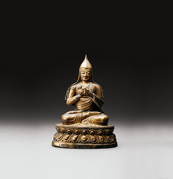 通體以捶鍱技法打製,薄胎體輕。頭戴黃教的通人冠,冠耳垂肩。身著僧袍,衣襬鏨飾捲草紋,衣褶流暢自然,兩肩原有托花(已失),雙手當胸結說法印,全跏趺坐,下承仰覆蓮座。 是件坐像工藝精湛,技法嫻熟,法相祥和慈悲,為藏傳佛教格魯派的典型造像。H: 39 cm