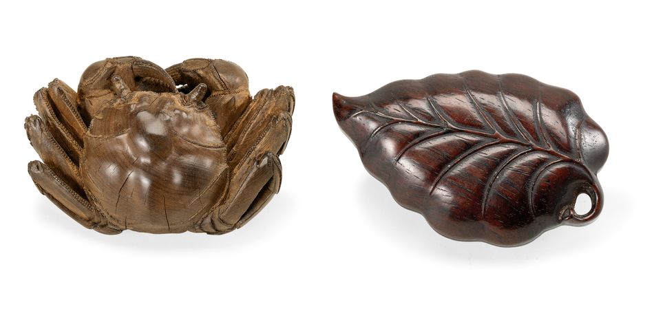 清 竹雕螃蟹及木雕葉型蓋盒(兩件一組)