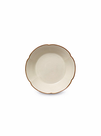 盤六瓣花口形製,盤壁微斜,通體施白釉,底部亦施有釉水,平底,口沿一周無釉鑲嵌有銅口,為北宋時期覆燒工藝燒製。此器釉色純淨,白若堆雪,花口器物傳世較少,器型周正完整者更稀有,所以此件定窯花口盤釉色白皙勻淨,保存完整,當為一件可遇而不可求的定窯佳品。