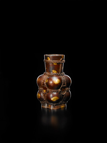 瓶敞口,直頸,頸下作四囊腹,圈足。瓶外壁起繩索,繩索緊緊綑繫四皮囊,然後復纏繞頸壁。局部點金裝飾,通體造型特殊,設計新穎,是一件藝術效果極強的案頭陳設。