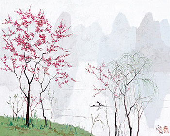 Spring River testifies to Pang Jiun’s ingenious depiction of a mountainous seascape. As the foliated branches of the flowering tree in the foreground beautifully imbued with magenta pinkish florets signifying the arrival of Spring opens up to a boundless magnificence view of the waterscape. A man sails peacefully on a sampan against a mountainous backdrop rendered in the artist’s signature tones of grey. The water so pure and clear that it almost sparkles as it ripples with the reflection of the mountainous scene far away into the distant. Art critic Pedro Tseng posits Pang Jiun as a researcher shuns both the older-generation preference of realist depiction to modern art, and a blind worship of the Western modernism which radically denies the classical heritage. He relates the classical to the modern, and imbibes their peculiarities to his advantage; in the process, he also discovers the thread running through oil painting and Chinese painting, particularly the Xieyi ink painting, despite their different systems. In the modernist masterpieces, he perceives the qualities of Xieyi, symbolism, and expressivity indicative of those of the literati painting. His examination of the theory and practice of both the modern Western oil painting and the Chinese ink painting leads to his conclusion that a highlight of Xieyi is one of the most important ways to regenerate Chinese oil painting. (Pedro Tseng, ‘Realism, Impressionism, and Eastern Expression: A Phenomenological Approach to the Cross-cultural Thinking in the Language of Pang Jiun’s Painting.)