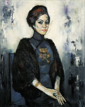 Tian Man-shi was both a poet and a painter, and was renowned as one of the leading female literary and artistic figures among the large number of Chinese citizens that sought refuge in Taiwan at the end of the Chinese Civil War. Born in Yancheng in China’s Henan Province in 1926, Tian died in Taipei, Taiwan in 2006. Coming from a wealthy family, Tian was able to study in Germany and Korea; she later studied landscape painting under Huang Chun-pi. A multi-talented, highly-cultivated artist with a wide circle of friends, Tian was an important figure in literary and artistic circles in Taiwan. This oil painting, “Portrait of the Painter Tian Manshi,” was completed by Shiy De-jinn in 1961. Tian was 35 at the time, and yet in this portrait she seems somehow ageless, with her chi-pao dress, shawl, jade bracelet and jadeite ring. Refined and elegant, it is clear from her expression that she considered herself the equal of any man.