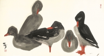 席德進的《群鴨》,直接用彩、用墨,保有傳統國畫「沒骨畫」的技法。不過,他將造型化繁為簡,群鴨化為簡約的視覺符號,空間布局活潑帶有趣味。番鴨,象徵鄉土的樸素形象,乃是藝術家在現代化城市生活情境的另一種慰藉。