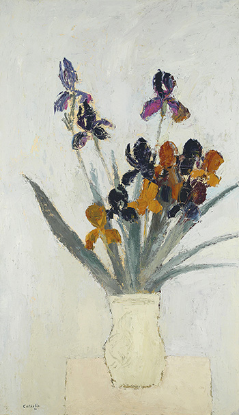 此幅《鳶尾花》筆觸大方,用色上並沒有採用常見的甜美和諧的暖色調,而是以米灰的泥土牆來陪襯鳶尾花的赤紅,打破了畫面冷色的調子,使得色彩對比強烈且和諧,並富有律動,色調也極具對比,使整幅畫面富有活力,洋溢著清新的氣息。畫中融入溫暖的米灰色、米白色、淡粉色及春意濃厚的粉綠色,散發無比浪漫懷舊的氣息。米灰色的背景,與畫中右邊勾勒出的花簇相映襯,使構圖向外延伸。幽靜的藍紫色鳶尾花十分突出,它的花形恰似一群翩翩起舞的蝴蝶;藝術家巧妙地將它那鬱鬱蔥蔥的粉綠色葉子作了低調的處理與高處的花草一同襯托出了鳶尾花的生動與靈性;再有低處赤紅鳶尾花,大朵,莖長,花蕊正對前方,成為畫面的亮點。後景則精細地描繪理花瓶上方優雅的三朵紫色鳶尾花枝葉,在一簇赤紅中顯得突兀——特立獨行孤傲的身影。二者相容處,以米色的以曲線勾畫出渾圓的花瓶,由瓶腳內縮至中段,乘載著自然插放的花束,花與葉、花與瓶緣情隨性的。那炙熱的紅與幽靜的紫是屬於另一種卡多蘭,伴著生命而來。