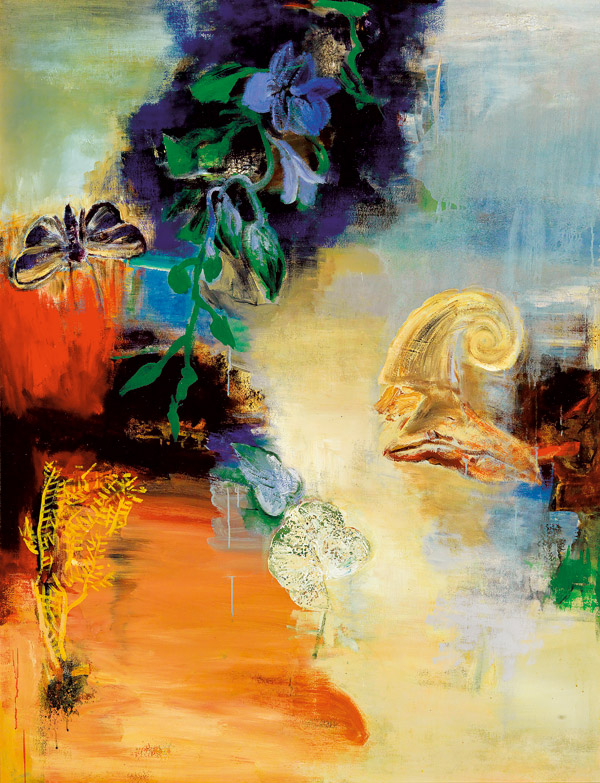 Signed on the reverse Chihung Yang and titled Dialog of Fire & Water in English, dated 1988 and inscribed 78 x 60 inches