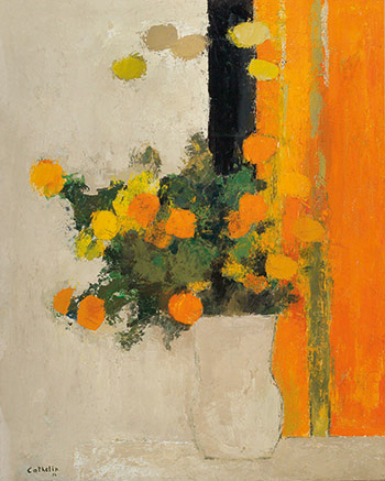 《萬壽菊》一畫融入溫暖的琥珀色、米色、黃色,以及略帶秋意的黃綠色,散發濃厚的懷舊與浪漫氣息。左半部明亮而簡純,彷彿可以看見和煦的陽光,在溫韾的家中灑落耀眼光輝,照亮花瓶中一束優雅佇立的花。這束花有雅緻的小花和蓊鬱的嫩枝,自然而生動。畫布右方描繪樸素的垂直色塊,將畫面一分為二,營造出空間感;與之對比的是以彎曲線條勾勒的花瓶,上方插著生動、自然的花束。這幅畫高貴且優雅,濃厚的詩意展現出卡多蘭對自然美景的熱愛。畫家運用色彩和半具象的畫風,突顯出題材的自然之美,向美好的世界致上敬意。他的用色非常豐富,對於造訪過的國家,經常將當地的代表色融入畫作,這些地方包括法國的德龍省、墨西哥、印度和日本。卡多蘭的畫作就像日本的俳句,饒富詩意。