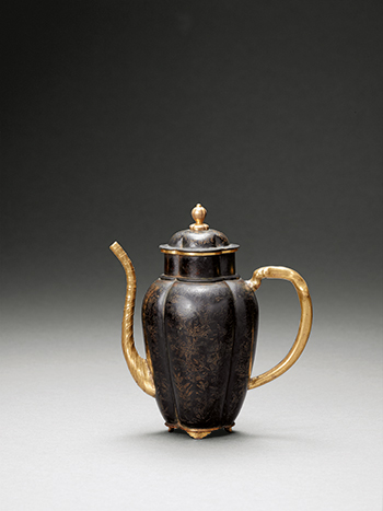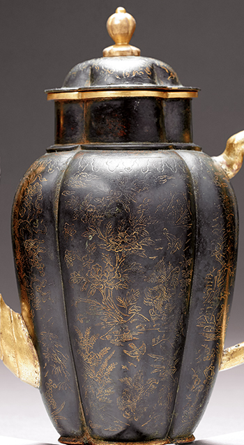 執壺做四瓣瓜棱式,器分蓋與壺,蓋上置圓珠高鈕。壺身花口,直頸,瓜瓣腹,腹下漸收,平底,下承四矮足。壺身一側出象鼻式長流,一側安環形長柄。通體鎏金,除頂鈕,壺口、長流、執柄與底部之外,其餘皆覆以黑漆,其中蓋壁與腹壁更以鏨刻技法,鏤飾繁縟的折枝花卉紋,由於鏨刻技法係以尖銳小刀在黑漆上摹刻裝飾紋樣,致使裝飾紋樣露出銅色顯花,故能營造鎏金花紋的錯覺,這也是清代中期黑漆銅器的典型裝飾風格。