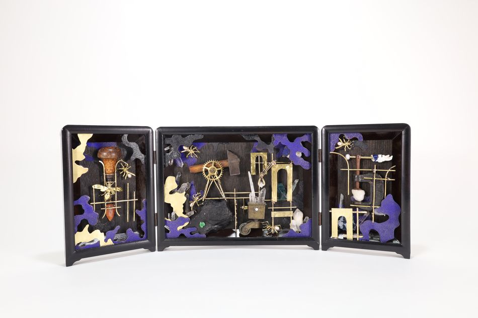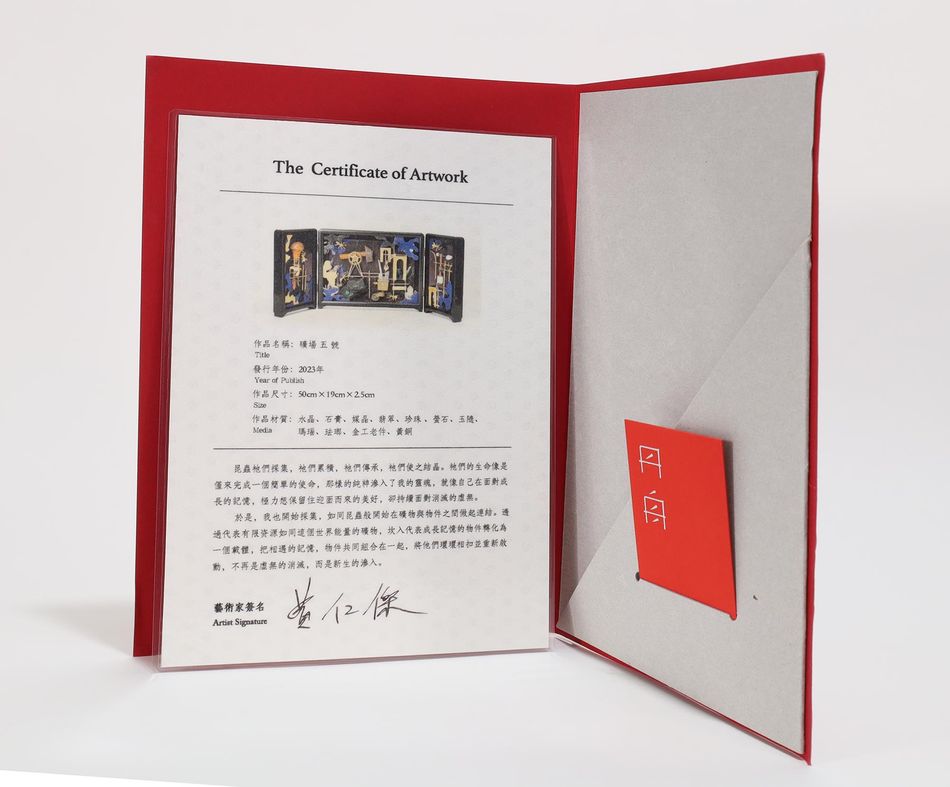 本拍場拍品呈現藝術家的《礦坑》與《礦場》系列創作,細緻的金屬與礦石水晶縱橫鑲嵌,構築出彷若無限延伸的空間,點綴在各角落的珍珠螞蟻正辛勤做工,在深幽錯縱的礦坑上下穿梭,而礦場其中的深邃也曖曖折射出如星塵閃爍般、內斂的光。