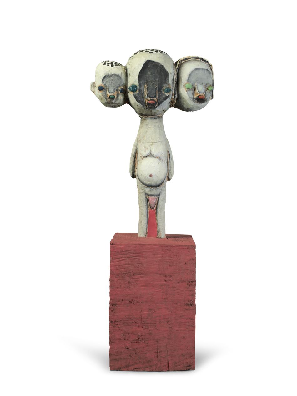 「繪畫應該像小朋友那樣隨意揮筆」加藤泉曾這樣描述,他喜歡古物,也喜歡逛博物館,尤其鍾情日本繩文時代的雕像固使加藤泉的作品特徵鮮明,時而雌雄同體、四肢纖長且姿態詭譎,彷若植物屬性卻又帶著動物般豐沛的生命力生長於土地的原始力量。2005年,加藤泉開始探索雕塑的三維空間,因此他開始了一系列木刻雕塑的創作,反覆出現的如神靈般的生物形象賦予了另一種形式的存在。他保留了木頭原始的質感,粗曠、原始有如充滿生命力的非洲雕塑,更為原生藝術的一種極致表現。此次秋拍羅芙奧現代與當代藝術敬獻加藤泉完成於2006的木雕作品《無題》,帶著風格化的三頭生物,怪誕且脫俗,亦表現出他對人類形象高度風格化的處理,使觀者面對藝術家於自然萬物的獨特詮釋,似人似神既親切又陌生的創作,嚴肅、靜謐卻充滿旺盛生命力,從平面到立體,從繪畫到雕塑,加藤泉自由豐富藝術特質創造出當代雕塑中無限大的可能性。