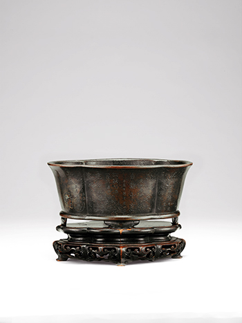 銅爐做海棠式,深腹,腹下漸收,平底,底部周緣出四矮雲葉式足。通體滿鐫各式古青銅器銘文,如「日利千金」、「壽明昌宜大富貴考」、「宜子孫」、「大吉祥」.等,又另一面署有「大明宣德年製」六字橫書款的四周,亦鐫刻蘇東坡的〈赤壁賦〉一文。全器以星羅棋布的規整銘文,營造出古雅的文人氣息,是明代銅爐中殊難一見的磅礡大器。
