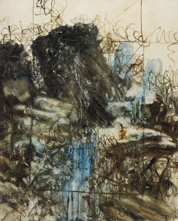 這件《山水精神》畫於1992年,正值周春芽創作歷史中,最為大破大立厚積薄發之時。畫面中溢出的當代藝術氣息和藝術家本身在那一時期的積壓、磅礡、釋放和激情讓觀者無法忘懷。細細品味,又似乎飽有「元四家」、董其昌、「四僧」等中國古典文人畫的精髓--筆墨雖然枯索,但卻包含奔放的真激情。畫面中似乎設在高遠處的山峰,若隱若現的石徑、流水、和森然的亂草無不透出古代文人的山水精神,那幾抹清淩的藍,也好似借用了明末清初「金陵八家」龔賢的筆下看似安靜平常,實則透出憂傷孤寂之氣的風景。讓人叫絕的是,除了載體媒介的當代性—畫布和帶有強烈筆觸的油彩以外,畫面中似乎是破壞性的西方現代主義的框框叉叉,完美表現了藝術家的豪情。同時,也昭示了他對於畫面整體的操控力和無法掩蓋的才情。