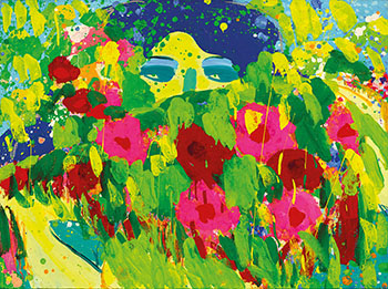 他樂於將生命中各個女性的微妙動人處表現出來,時而持扇掩面半露勾人眼光;或時而在花團錦簇中暗自嬌羞;丁氏筆下的女人總耐人尋味,而藉由女人畫像他暗度陳倉般地將自己的情感傳達其中,這幅《愛如潮水》作品裡,可見到的是丁雄泉作畫最大的靈感來源;「女人」、「花朵」,而也正是在此時,年近耳順的他卻迸發出巨大的創作能量,已經不受任何流派約束的他在畫布上任意妄為,盡情奔灑他的情感以及對女性的迷戀;瑰麗的用色,繽紛炫麗的色彩氛圍,再再顯示了這此作的成熟。或許對於丁氏來說,「花開堪折直須折、莫待無花空折枝」的精神是他創作的圭臬;而女人如此,藝術更亦如此;一生風流不羈,總以「採花大盜」自居,而他的人生觀全然無遺地在他的作品上呈現。