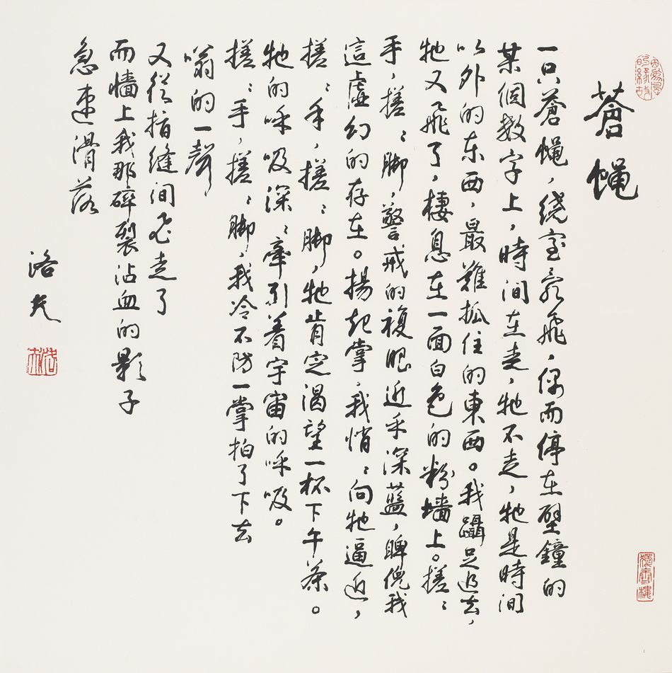 釋文:一只蒼蠅,繞室亂飛,偶而停在壁鐘的某個數字上,時間在走,牠不走,牠是時間以外的東西,最難抓住的東西。我躡足追去,牠又飛了。棲息在一面白色的粉牆上。搓搓手,搓搓腳,警戒的複眼近乎深藍,睥倪我這虛幻的存在。揚起掌,我悄悄向牠逼近,搓搓手,搓搓腳,牠肯定渴望一杯下午茶。牠的呼吸深深牽引著宇宙的呼吸。搓搓手,搓搓腳,我冷不防一掌拍下去,嗡的一聲,又從指縫間飛走了,而牆上我那碎裂沾血的影子,急速滑落。