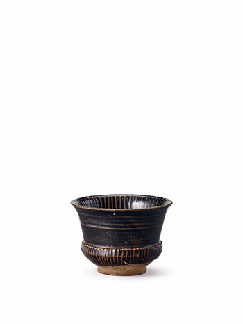 This zhadou’s rim is thin, curving slightly outwards, The upper part shaped as a trumpet, the lower part a jar with a very trim waist and full belly, and with a high foot and no glaze on the bottom. This ware is covered in black glaze and decorated evenly in vertical lines. The colors of the glaze and the lines stage a strong contrast. This kind of decoration is commonly seen in northern kilns, mostly on jars but rarely on zhadou, making this piece all the more precious.