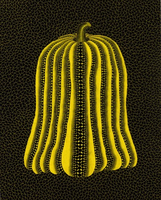 草間彌生以藝術創作來治療她的創傷,因此她的作品都傳達著她內心 深處的情感。《南瓜》跟草間彌生的其他作品一樣,集合了她各個 系列的視覺元素,呈現自小困擾著這位藝術家的幻覺。草間以大大小 小的黑色圓點排列成南瓜的形狀,艷麗奪目的黃色欲躍而出,鮮明的 對比帶來了巨大的視覺震憾。背景中黃色的幼細線條形成了「無限的 網」,突顯出南瓜的飽滿形態。《南瓜》的主題源自草間彌生兒時在 農場所產生的幻覺,當時她看見南瓜跟她說話,深深被南瓜圓潤的形 狀所吸引。草間彌生把自己的幻覺經歷投射在其作品中,透過攝人心 魄的作品釋放壓抑的情緒。她說:「 我就是以這樣的方式,讓當下感 受到的驚嚇和恐懼漸漸沉澱,這些經歷可以說是我畫畫的初衷。 」此 件拍品尺幅碩大,極為罕有,是拍賣市場上尺幅最大的直式《南瓜》 畫作,珍貴非常。