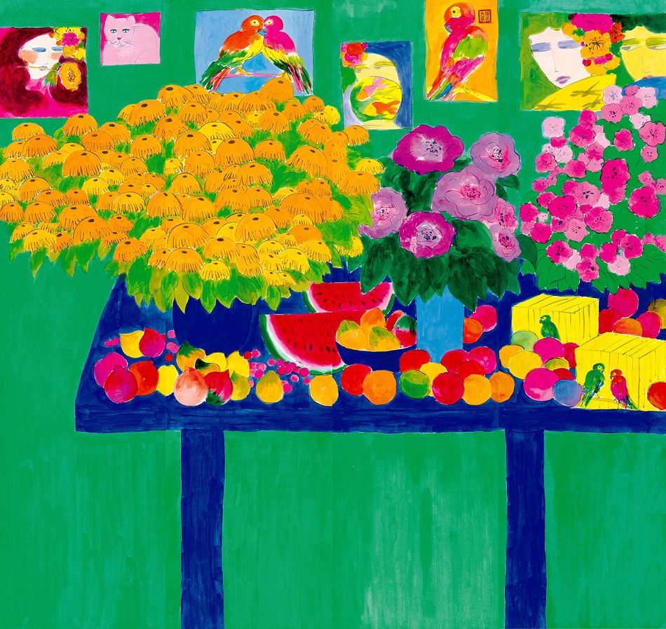 When staying in Paris, Walasse Ting was attracted and greatly influenced by Henri Matisse’s vivid, bright, and contrasting color usage in Fauvism. On the other hand, he was also inspired by the energetic and flexible color dispositions in Chinese folk drawings, which also made him to draw seamless lines freely without any modification. One of the most remarkable features in his works is that the contrasting color dispositions can actually create harmonious images. Moreover, Walasse Ting does not use any specific color to outline different sections in a painting. Instead, outlines are actually shaped from the slim overlaps of the colors of the connected sections in order to create a united and energetic image as a whole. In “The Artist's Garden”, each separate part is the powerful expression of Ting’s fascination: woman, fruit, parrot, and the support of everything – color. These are the elements Ting has spent his whole life on. Unlike other artists who try to purposely organize
