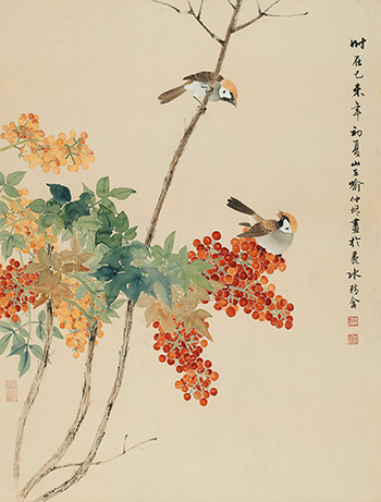 As an apprentice of Jin Boqin, Yu Zhonglin attained an impressive level of traditional Gongbi Style form, to articulate objects’ spiritual quality. Apart from Chinese paintings, Yu also learnt the quintessences of Japanese floral and bird paintings. Every detail was painted with meticulous care making each object springs to life in the painting. Along with the Song’s composition cleverly employed, the two sparrows spring to life chasing after the fruits, forming an interesting scene.