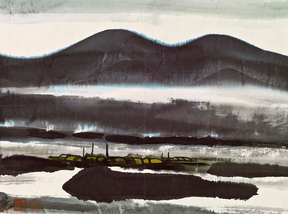 Lin Fengmian painted "Landscape with Fishing Boats" around 1960. At this time Lin had retired from public life and was living quietly in Shanghai; he must surely have been able to sense the approaching storm of the Cultural Revolution, and expressed this feeling in landscape painting in a similar manner to the literati painters of old. The depiction of light and shadow in this painting – with the same color being used for water and sky – makes it a true masterpiece.
