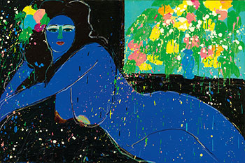 二十世紀的1970年代起,旅居紐約已超過十年的丁雄泉匯集了巨大的創作能量,畫風從抽象藝術轉變至具象繪畫,而他最多的情感與創作則都留給了他畢生鍾愛的主題─「女人」;在紐約的丁氏發展了筆觸濃烈狂野,用色強烈不拘帶點驕傲與放縱不羈;這縱然與丁氏天性有關,而在藝術氛圍大放,自由且充滿未來感的紐約更是引領著他日後風格的確立;1970年代,丁雄泉由抽象作品轉至具象繪畫,畫風大轉以外,他的心境也隨之更迭,開始大量地創作他一生中摯愛不倦的題材,「女人」;這時期的作品則清楚的看見了野獸派般的描繪線條,然而更多的是早先在歐洲,眼鏡蛇畫派對他繪畫語彙的影響;華美斑斕,更加強烈放膽地在畫布上繪出一具具風姿綽約、時而艷麗華美又或熱情狂野的女性姿態,其中如完成於1975年的大型創作《世界小姐》正是丁雄泉在此時期創作的巔峰代表。爾後創作於1976年的《在月光下親吻我》,大膽地以近乎全黑的色塊作為背景,曖昧氣息流淌,而單以蠟筆勾勒出線條的畫中女主角側臥橫躺,慵懶扶頭望著前方,態度從容大方,自信不拘泥地散發著引以為豪的美麗身軀;手法流暢俐落地繪出女主角動人之處,在暢情地揮灑中流洩出藝術家充沛著自信與川流不息的生命力;畫中女人同樣選用低亮度的藍色,如湛藍大海般的捉摸不已,營造出了深邃的神秘;其同年代創作中如1977年的《炙熱的愛》亦同樣是藍色女體,皆是散發出了濃厚的引誘力,勾人目光;從後方的盆花清楚地揭示了丁雄泉對於美國抽象表現主義的追隨;滴流、潑灑,甚至僅只是以一團團的鮮豔色彩代表鮮花與他迸發的情感都是如此得恰當,滿溢春光。