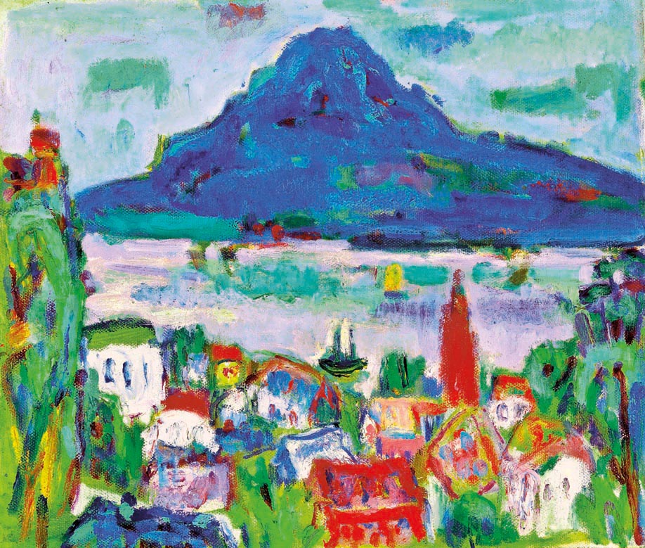 廖繼春以其獨特的視角,大膽使用鮮豔原色,曾被譽為是色彩的魔法師。他將《觀音山》描繪成一幅華美燦爛的河景,尺幅雖不大,但畫風自信給人豐盈盛大之感。由上而下,淺藍的天空襯著湛藍色觀音山,悠悠的淡水河,緊密相接的小鎮屋舍,將畫面三分切割,疏密有致,有和諧平衡之美。而亮黃的船帆、豔紅的教堂尖頂,粉白的牆,嫩綠的樹,繽紛的顏色將畫面粧點得活潑生動,頗具童心,賞心悅目。