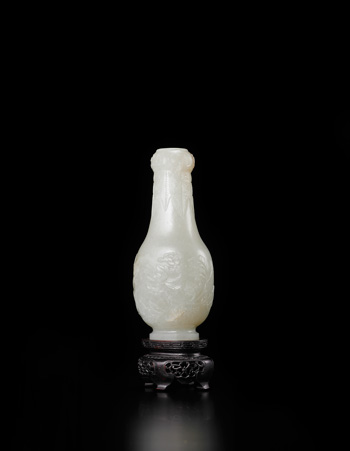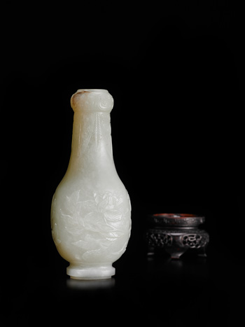 Of compressed globular form resting on a protruding oval foot, finely worked with flowering peonies blossoms amidst undulating foliate scrolls on the body, encircled by a band of lappets around the slender neck with further c-scrolls on the bulbous section below the mouth rim, the stone with paler snowy speckling throughout.
