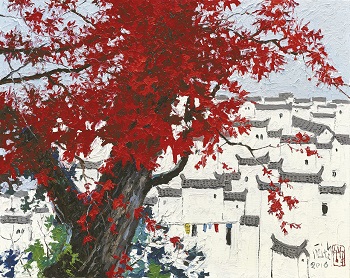 《不似春光勝似春光》前景中大面積綻放的紅楓,隨風春風搖曳,以東方喜氣的豔紅遍佈在畫面中,與素雅的徽式建築形成對比,卻不失大氣、層次分明,透過明暗對比的布局帶出激動人心的情緒。